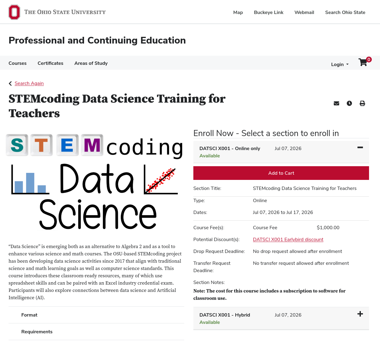 Our new continuing education course is open to teachers everywhere. The online only option will meet daily via Zoom while the hybrid option will meet in person at OSU Marion for July 7 & 8 and online for July 9 - 17 (except for the weekend). The cost of the course includes software for you to use in your classroom. There is an early bird discount, so sign up soon! Upon completing the course, participants will receive a certificate stating they have completed up to 3.0 Continuing Education Units (CEUs).